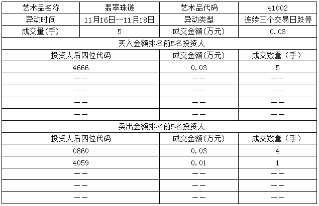 上市艺术品翡翠珠链(41002)2015年11月16日、2015年11月17日、2015年11月18日连续出现三个跌停,根据《天津文化艺术品交易所暂行规则》相关规定,认定其属于异常波动。