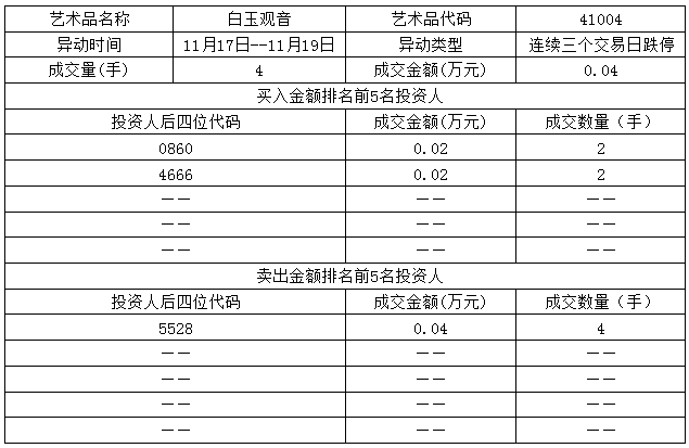 上市艺术品白玉观音(41004)2015年11月17日、2015年11月18日、2015年11月19日连续出现三个跌停,根据《天津文化艺术品交易所暂行规则》相关规定,认定其属于异常波动。